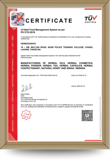 Herboganics holds a Halal Food Management System certification from TÜV Austria, affirming that our entire range—including herbal oils, teas, capsules, and natural honey—meets the requirements of PS 3733:2019. This certification assures our clients worldwide that our products are ethically produced, permissible, and safe for consumption in accordance with Halal standards