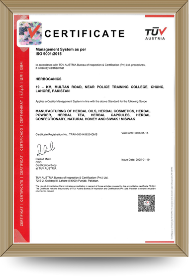 Herboganics is ISO 9001:2015 certified, a testament to our strong focus on quality, customer satisfaction, and continuous improvement. This certification guarantees that our processes, from herbal cosmetics to confectionary and siwak, are managed under a globally recognized system of excellence. It reinforces our ability to deliver consistent, high-quality products every time